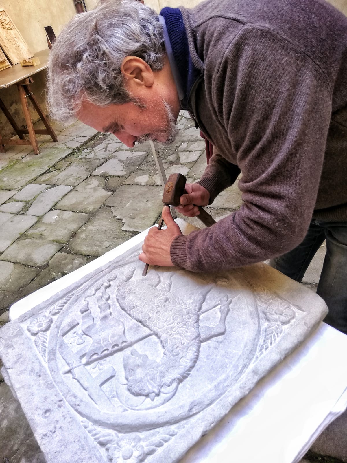 In the following years, he devoted himself to sculpture, specialising in the manual working of marble, “pietra serena” sandstone and travertine. He creates unique pieces, such as heraldic coats of arms, fireplaces, portals and any decorated architectural element in strict respect of the original forms and observing the ancient traditions of stone materials processing.