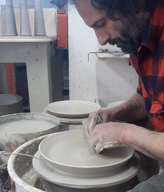 In his production, he applies manual processing techniques, mainly on the potter's wheel, using different mixtures, depending on the result he wants to achieve with the glaze.