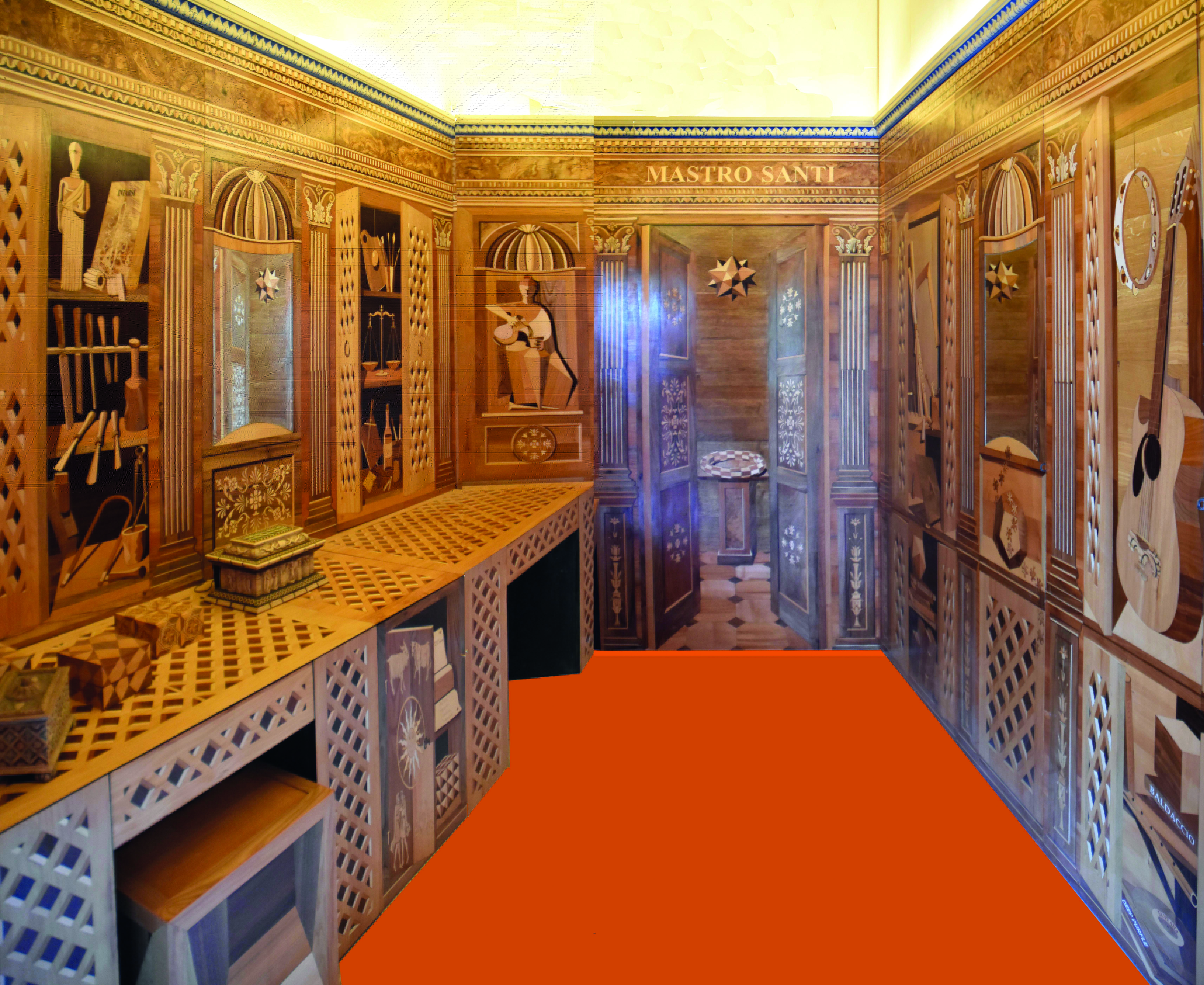 Tra le sue opere più rilevanti merita una speciale menzione il sorprendente studiolo intarsiato in stile rinascimentale che i visitatori potranno ammirare all'interno del suo laboratorio.
